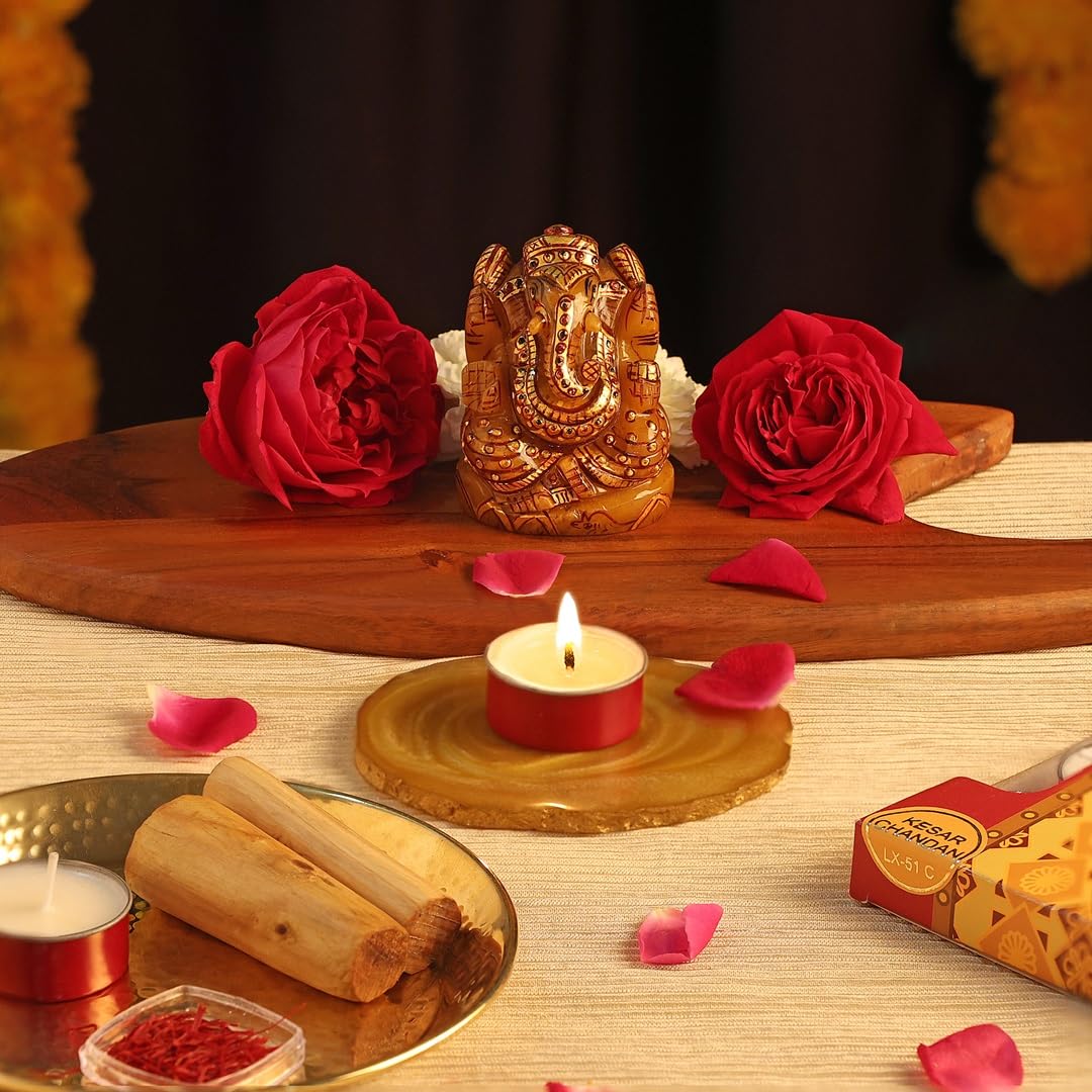 - Indulge your senses with the divine fragrance of Kesar Chandan. Each tea light is delicately infused with this sacred blend, filling your surroundings with a captivating aroma that soothes the soul and uplifts the spirit.