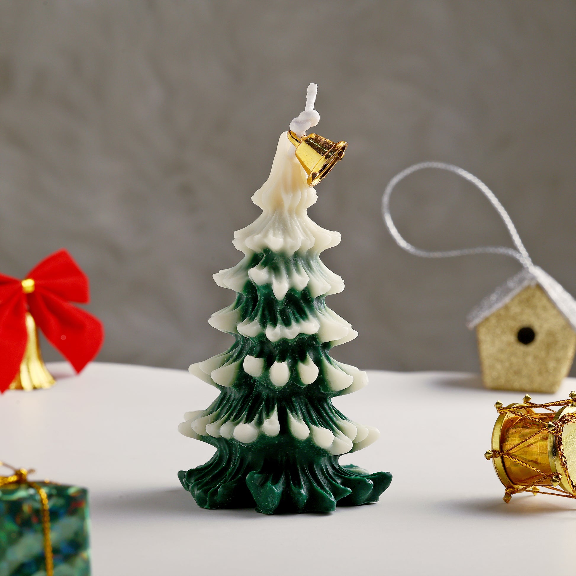 Bring festive charm into your home with this beautifully crafted Christmas Tree Candle, designed with realistic layers of green pine branches topped with soft white snow. The elegant golden bell adds a touch of holiday magic, making it perfect for Christmas décor, gifting, or table displays.