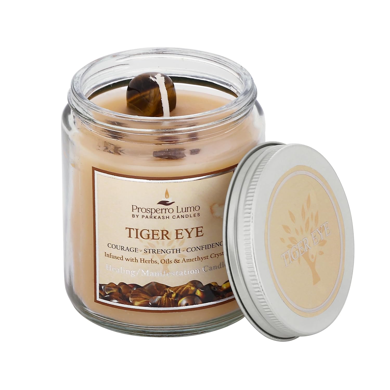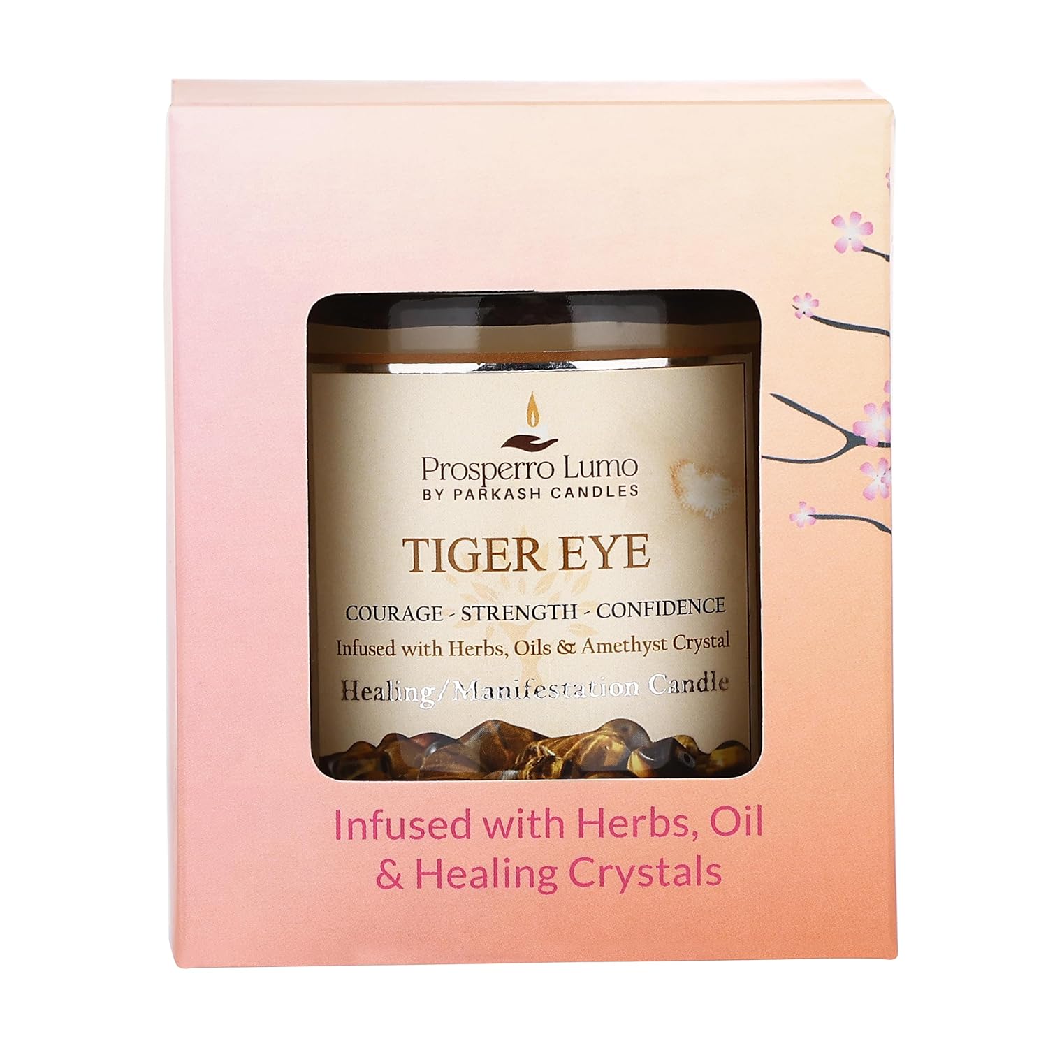 PROSPERRO LUMO by Parkash Candles Crystal Scented Jar Candle โ Infused with Herbs & Healing Crystals | Calmness, Intuition & Clarity | Paraffin Wax | Gift Box | 30+ Hour Burn Time | (Tiger Eye)